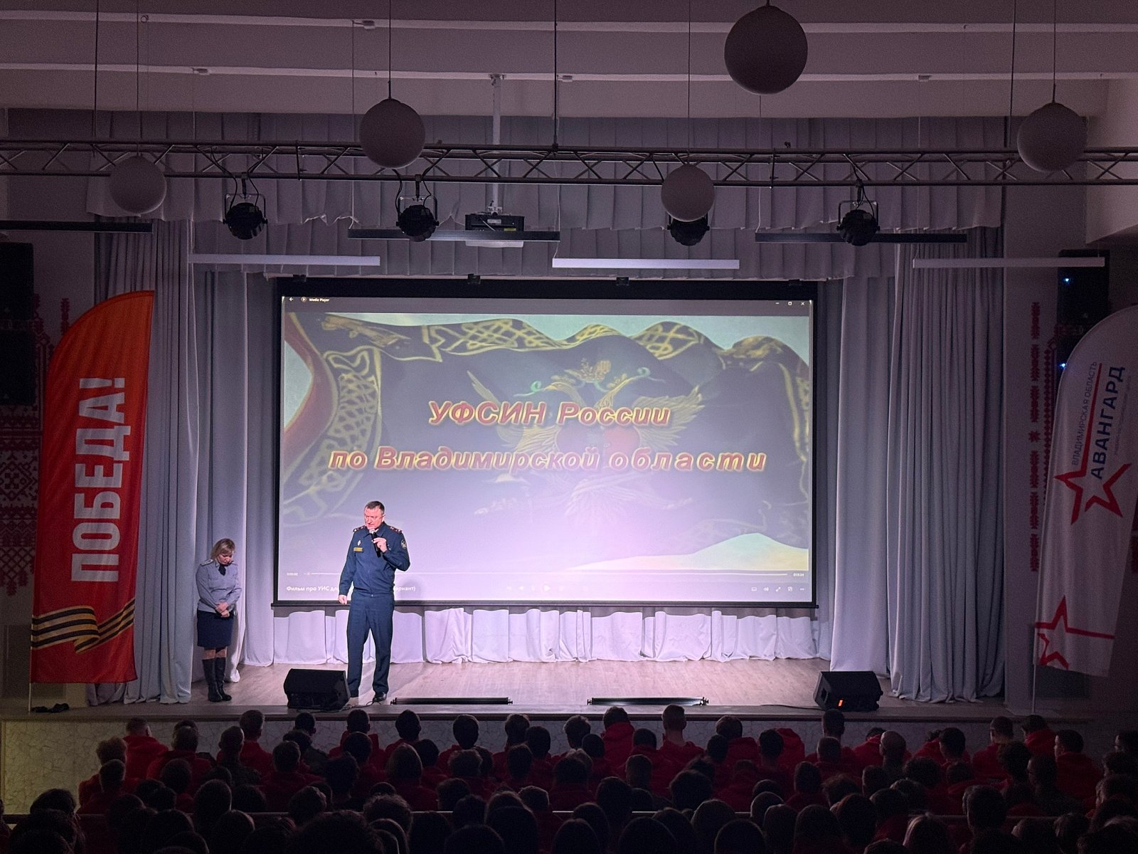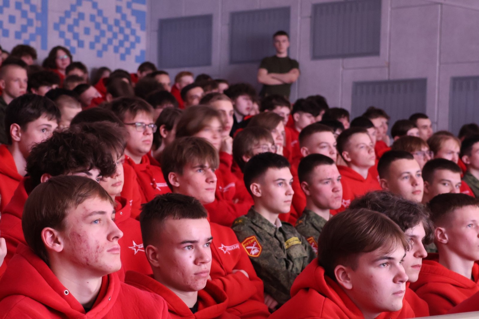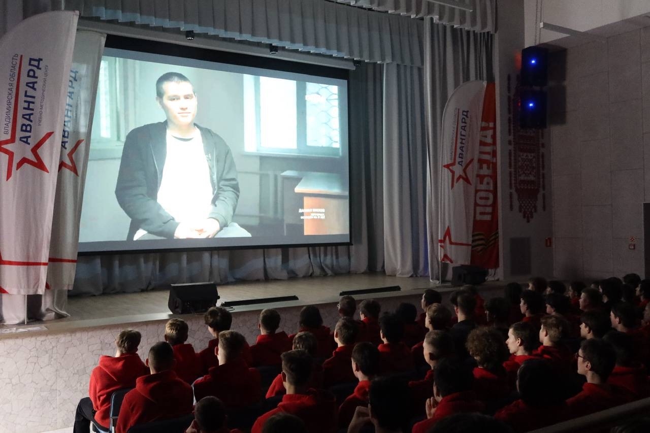 Курсанты собрались в актовом зале для просмотра документального фильма, посвящённого событиям Великой Отечественной войны.