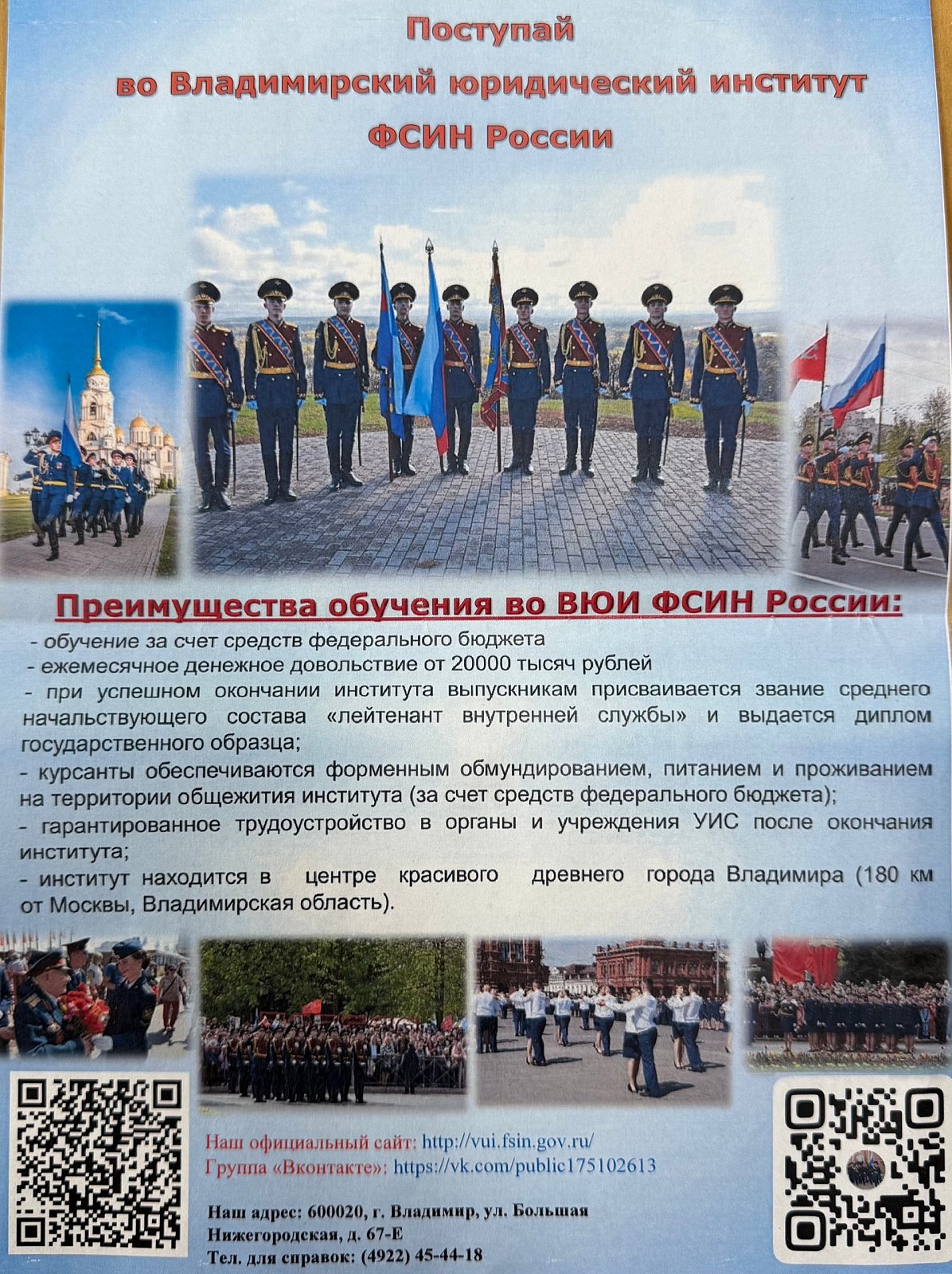 Гости рассказали курсантам о службе в уголовно-исполнительной системе, особенностях профессиональной подготовки и перспективах трудоустройства. Ребята узнали о требованиях к поступлению во Владимирский юридический институт ФСИН России, об учебной, научной, спортивной и культурной жизни курсантов, а также о направлениях деятельности сотрудников УИС.